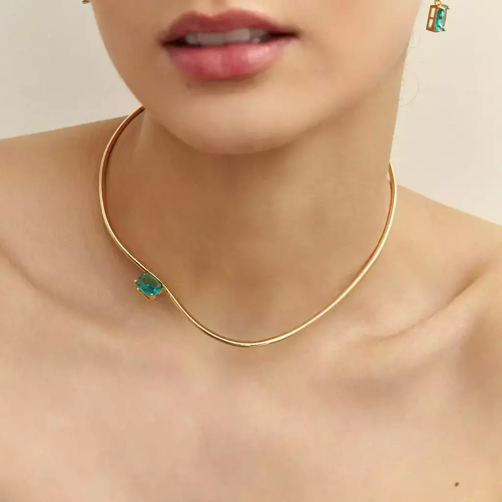 Esta gargantilha é a definição de uma joia moderna e elegante. Seu design em aro, complementado por um deslumbrante cristal retangular de turmalina, cria um visual sofisticado e minimalista.