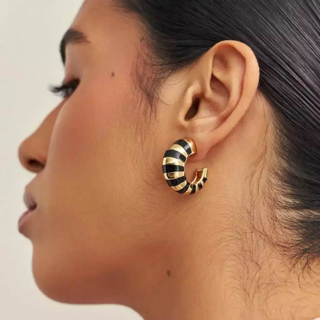 Este brinco é a combinação perfeita de modernidade e sofisticação. Com um design de meia argola abaulada, ele se destaca pelo seu acabamento em esmalte preto brilhante e seu banho em ouro, que conferem um visual elegante e atemporal.