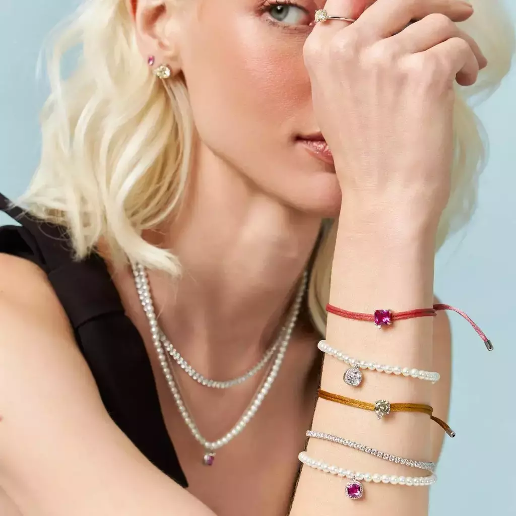 Composta por uma corrente de pérolas shell e um pingente quadrado com uma zircônia cintilante na cor rosa-escuro, a pulseira tem 18 cm de comprimento, com um extensor para um ajuste perfeito.